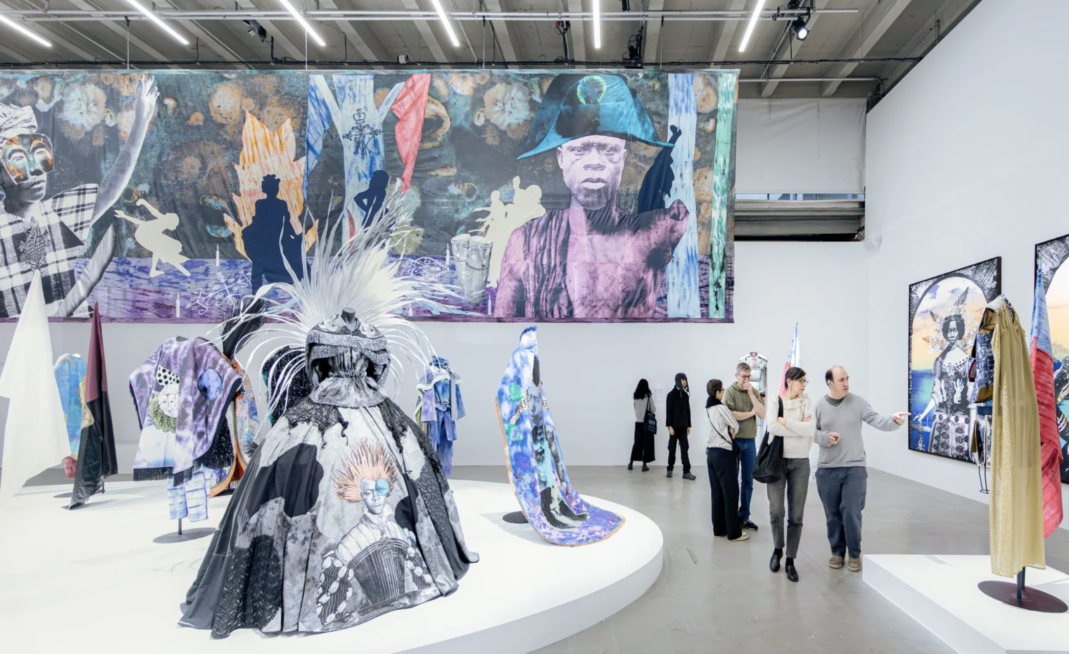 Em 2023, ele fez "We Could Be Heroes" no Panthéon em Paris. Em 2025, "Quelque part dans la nuit, le peuple danse" no Palais de Tokyo. Nos dois casos, levando essa estética carnavalesca, celebração identitária e resistência poética pra dentro de instituições francesas tradicionais. Descobri o trabalho dele no estande da galeria Marianne Ibrahim na Paris Plus, hoje Art Basel Paris em 2022.
