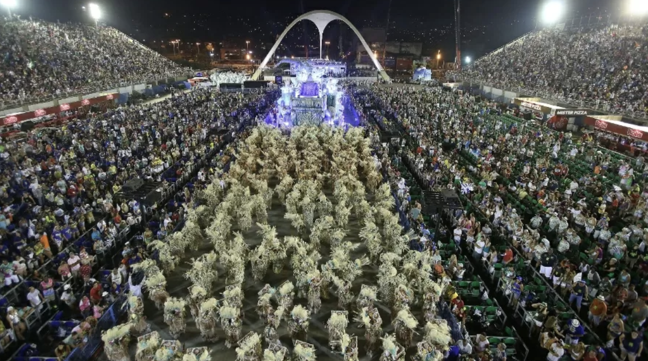 O Sambódromo: 700 metros de passarela, arquibancadas que acomodam dezenas de milhares de pessoas, e a Praça da Apoteose com o arco parabólico de concreto de 30 metros. Niemeyer disse que se inspirou nas curvas do corpo feminino das passistas. É onde acontece a obra de arte total de que estamos falando.