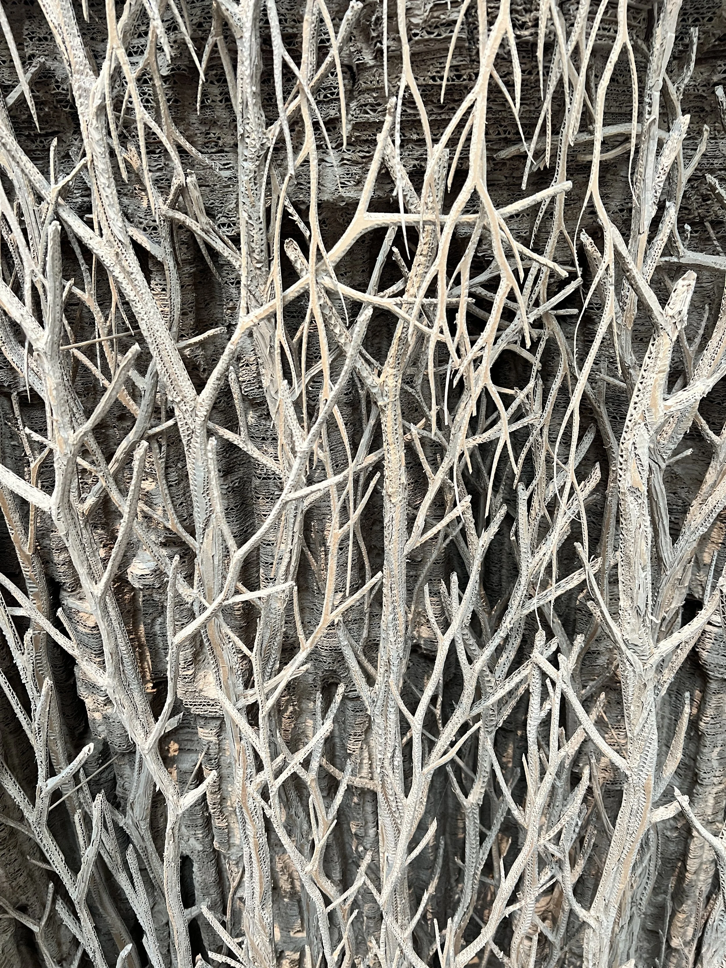 Ela pega esse material industrial, descartável, humilde, e o transforma em gruta, em floresta, em ruína romana, em ninfeu barroco. Camada por camada, corte por corte, colagem por colagem. Numa entrevista, ela explicou que o papelão é um material que não exige reverência. Disponível em abundância, barato, e que permite trabalhar como se faz com a pintura: corrigindo, sobrepondo, voltando atrás.