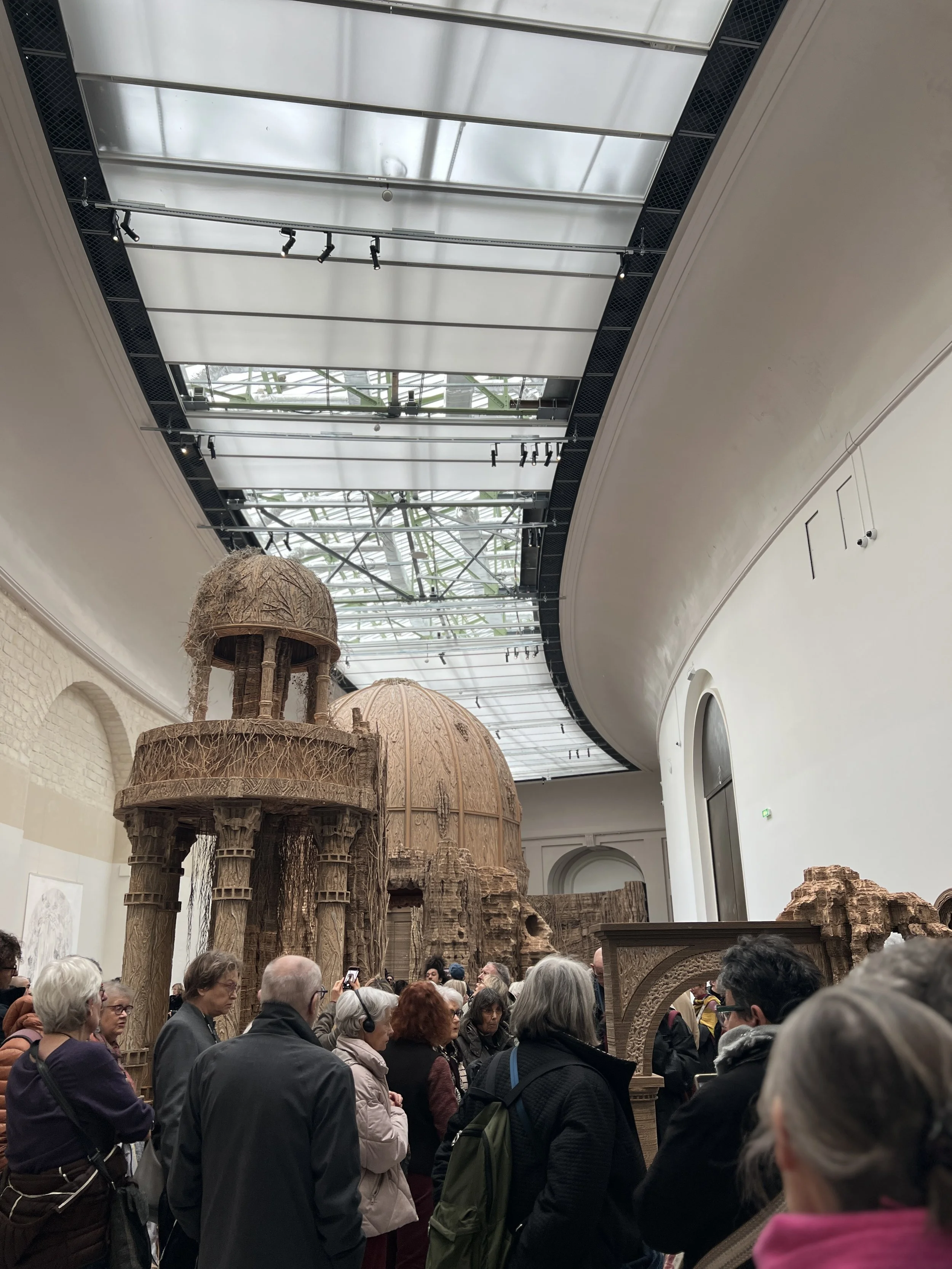 Aí veio a Art Basel. Galleria Continua. E eu finalmente vi, ao vivo, uma floresta de papelão. Fiquei parada na frente de uma floresta de papelão pensando: isso aqui pode ser tanta coisa… cenografia, escultura, arquitetura, paisagem mental. Depois foi a individual dela na Continua do Marais, Tromper l'œil. E agora, Grottesco no Grand Palais. Quando fui, estava lotado. Fila pra entrar e muita gente fotografando. O que eu mais gostei de ver foram as turmas de escolas ouvindo atentamente os monitores explicarem a obra dela. Gente parada em silêncio absoluto diante de grutas de papelão como se estivesse numa catedral. Maravilhoso.