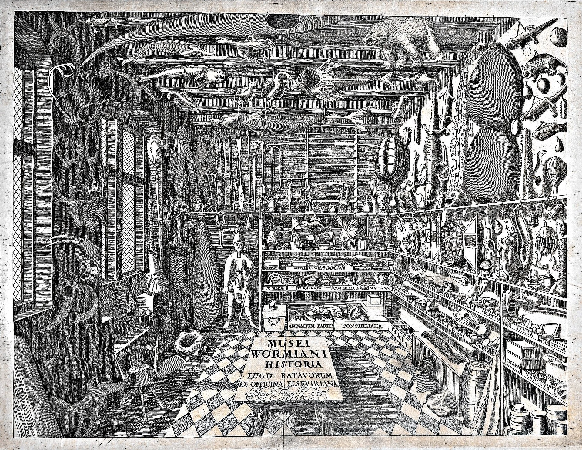 Gravura antiga de um gabinete de curiosidades